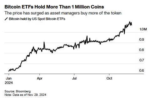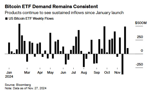 然而,就目前而言,随着市场等待特朗普和新一届国会的到来,比特币正处于一个蜜月期,在这段时间里,很难找到许多短期看空比特币的投资者。毕竟,这种资产的价格已经从2010年的5美分上涨到如今的近10万美元,而且美国ETF降低了对FTX等加密货币初创公司的风险,后者在2022年倒闭,并且其带来的风险在整个加密货币行业蔓延开来。