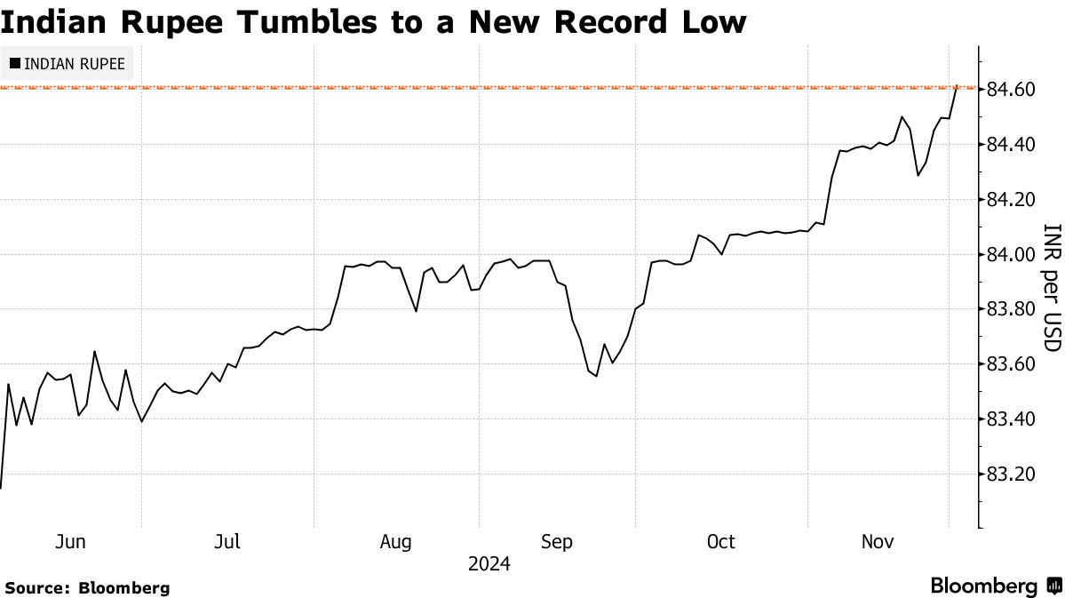 智通财经APP获悉,上周五,印度经济增长数据显著放缓至近两年来最低水平,导致印度卢比兑美元汇率跌至接近84.60的历史新低。同时,债券市场因市场预期印度储备银行可能早于预期降息而持续上涨。美国总统当选人特朗普对金砖国家使用美元的要求,进一步推高了美元汇率,给包括印度在内的新兴市场资产带来了压力。