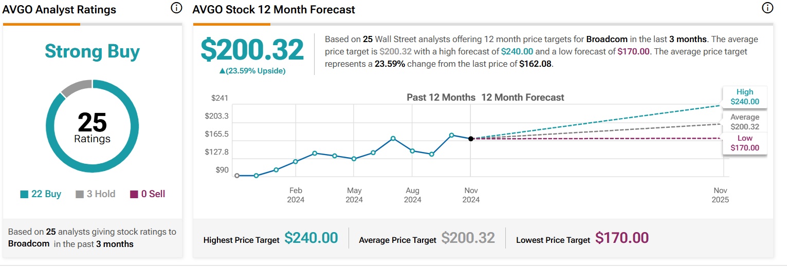 因此,尽管近期股价表现相对疲软,但多数分析师认为投资者无需对博通股价以及业绩前景持悲观态度。TIPRANKS汇编的华尔街分析师评级与目标价显示,博通未来12个月平均目标价高达200美元,共识评级为“买入”,没有出现任何“卖出”评级。其中,Cantor Fitzgerald近期将博通目标价从200美元上调至225美元,瑞穗则将博通目标价从190美元大幅上调至220美元。相比之下,博通股价上周五收于162.08美元。