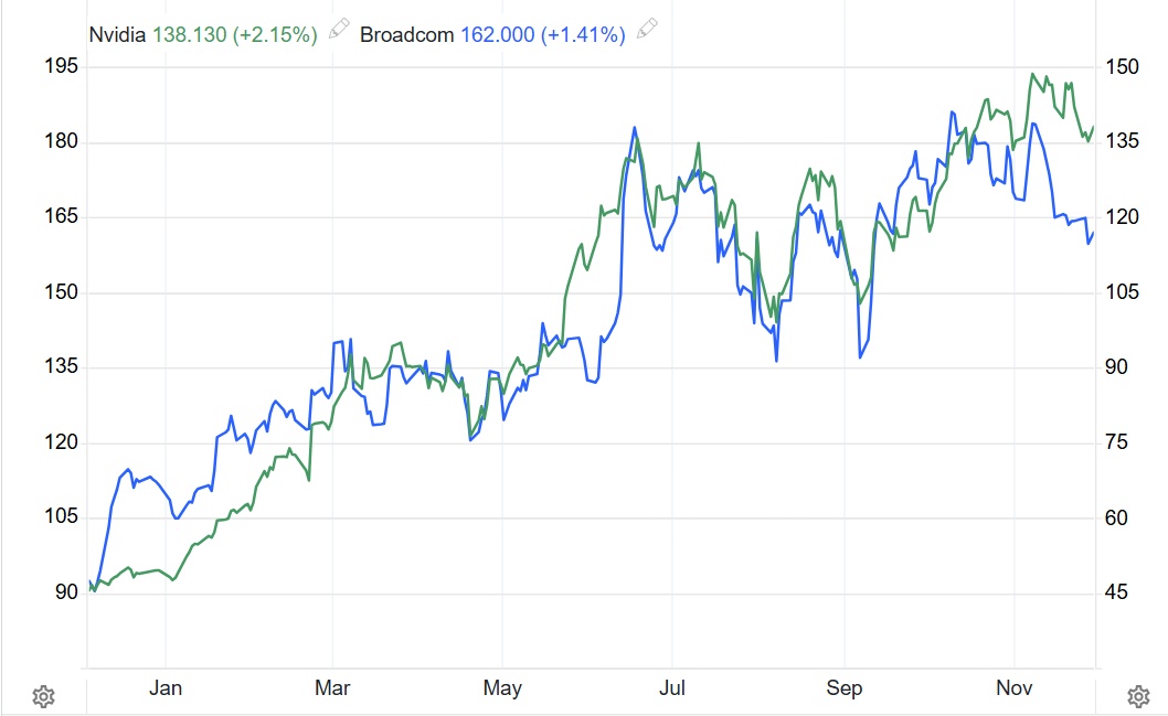 自2024年10月以来,全球AI热潮最大赢家之一博通近日股价表现逊于跟踪美股市场热门科技股的ETF——科技行业ETF(XLK.US),以及美股芯片股基准——费城半导体指数(SOX)。