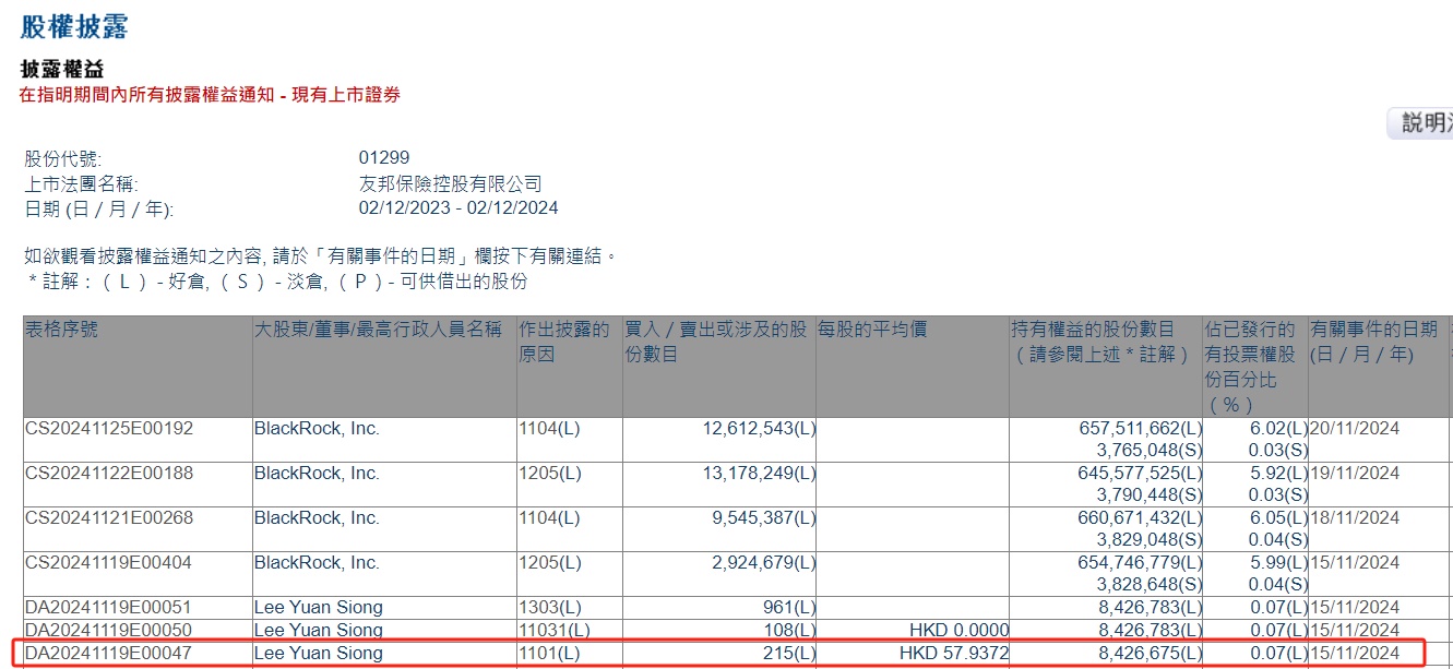 Siong增持友邦保险(01299)215股,每股作价57.9372港元,总金额约为1.25万港元。增持后最新持股数目约为842.67万股,最新持股比例为0.07%。