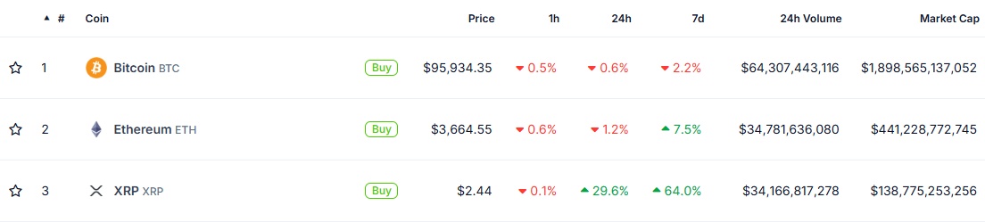 智通财经APP获悉,根据加密货币数据提供商CoinGecko的数据,与Ripple Labs相关的瑞波币(XRP)在过去24小时内上涨了近30%,至2.44美元/枚,市值升至约1388亿美元,成为市值第三大的加密货币。而在11月5日选举日时,瑞波币的市值还不到300亿美元。
