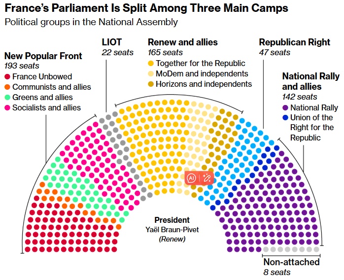 马克龙提前选举的赌注导致下议院分裂为三个激烈对立的党派:执政党所在的中间派、由玛丽娜·勒庞领导的极右翼阵营,以及左翼联盟“新民众阵线”。由于不可能组建联合政府,马克龙于9月任命巴尼耶为总理,其核心任务是整顿法国混乱的财政状况。