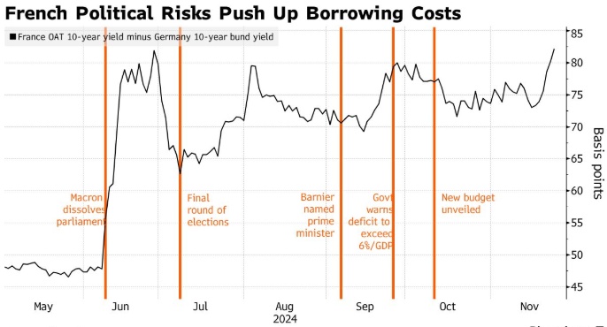 尽管如此,在这种背景下,债券投资者抛售法国资产,上周将法国国债收益率一度推高至希腊的水平,并导致巴尼耶警告金融市场可能出现“风暴”。
