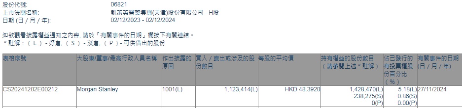 智通财经APP获悉,香港联交所最新资料显示,11月27日,摩根士丹利增持凯莱英(06821)112.3414万股,每股作价48.392港元,总金额约为5436.43万港元。增持后最新持股数目约为142.85万股,最新持股比例为5.18%。
