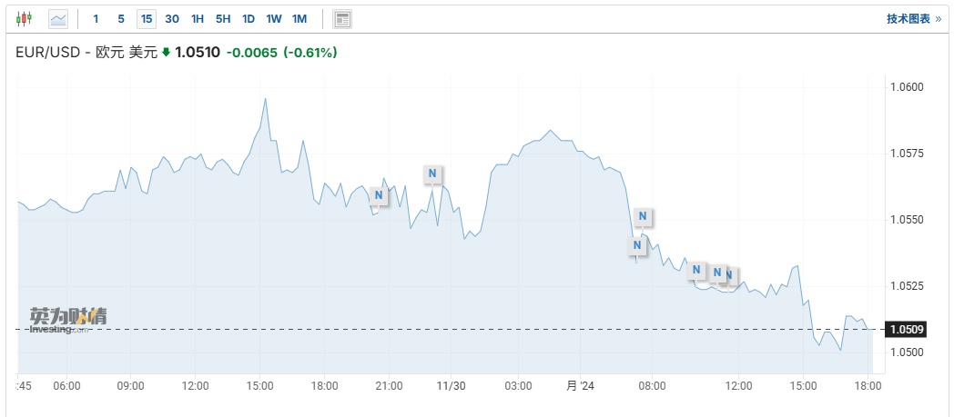 受此消息影响,截至发稿,欧元兑美元汇率跌0.61%,报1欧元兑1.051美元,日内早些时候一度跌至1欧元兑1.0496美元。