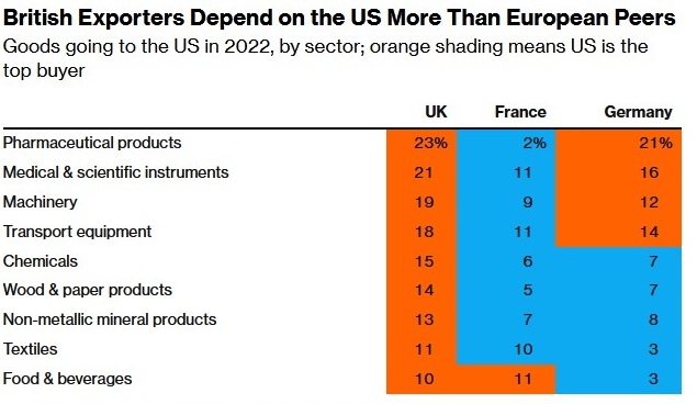 麦肯锡英国与爱尔兰研究与经济主管Tera Allas表示:“仅就商品而言,美国在英国许多领域的出口中占主导地位,高于欧盟主要国家的出口份额。”