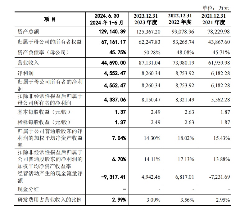 财务方面,于2021年度、2022年度、2023年度以及2024年1-6月,弘景光电实现营业收入分别约为6.20亿元、7.40亿元、8.71亿元以及4.46亿元。同期,该公司实现净利润分别约为6182.28万元、8753.92万元、8260.34元以及4552.47万元。