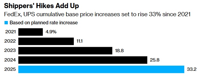 智通财经了解到,这两家快递公司的基准费率在过去五年中有四年都超过了通胀率,其中包括计划在2025年涨价。第三方物流公司AFS Logistics的首席分析官Mingshu Bates表示,这将使自2021年以来的累计价格涨幅达到近33%。这还不包括特殊燃油附加费、偏远地址附加费和特殊尺寸包裹费——这些额外的费用可能会持续一整年。