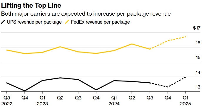 据估计,在去年小幅增长之后,联邦快递本财年的每件包裹收入预计将增长4.6%。其次,分析师预计在今年下降后,联合包裹2025年每个包裹的收益将增长1.9%。