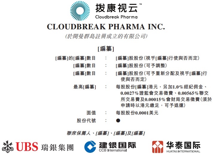 智通财经APP获悉,据港交所12月2日披露,CLOUDBREAK PHARMA INC.(拨康视云)第三次向港交所主板提交上市申请书,瑞银集团、建银国际、华泰国际为其联席保荐人。该股曾与2023年11月、今年5月向港交所提交过上市申请书。