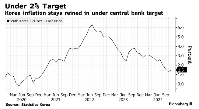 Bloomberg Economics经济学家Hyosung Kwon表示:“在韩国央行于10月和11月连续降息后,通胀放缓应为其在2025年进一步降息铺平道路。在出口放缓、内需疲软的情况下,经济需要支持。”