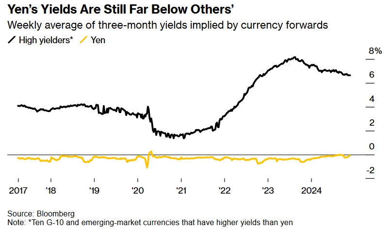 尽管日本央行正在逐步加息来提高基准利率,但日本与美国等主要经济体之间的收益率差距仍然很大。美联储在11月将基准利率下调了25个基点,至4.5%-4.75%的区间,仍然远远高于日本基准利率。根据Australia & New Zealand Banking驻悉尼的外汇分析师费利克斯·瑞安的说法,即使日本将基准利率提高到1%左右,基于日元的套利交易的逻辑仍然成立。