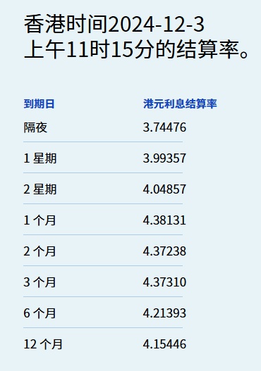 智通财经APP获悉,12月3日,港元拆息个别发展,其中,隔夜息再跌10基点至3.74476%,为11月27日以来最低,但与楼按相关的一个月拆息连升六天,报4.38131%,创七周新高。