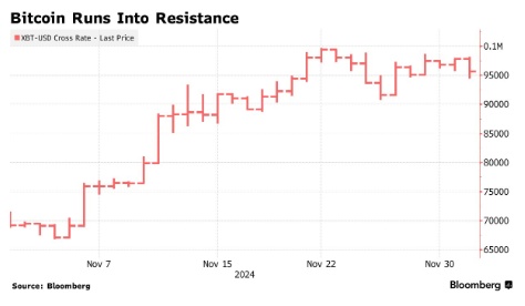 截至发稿,比特币价格稳定在95734美元。11月22日,该数字货币一度创下99728美元的历史新高。