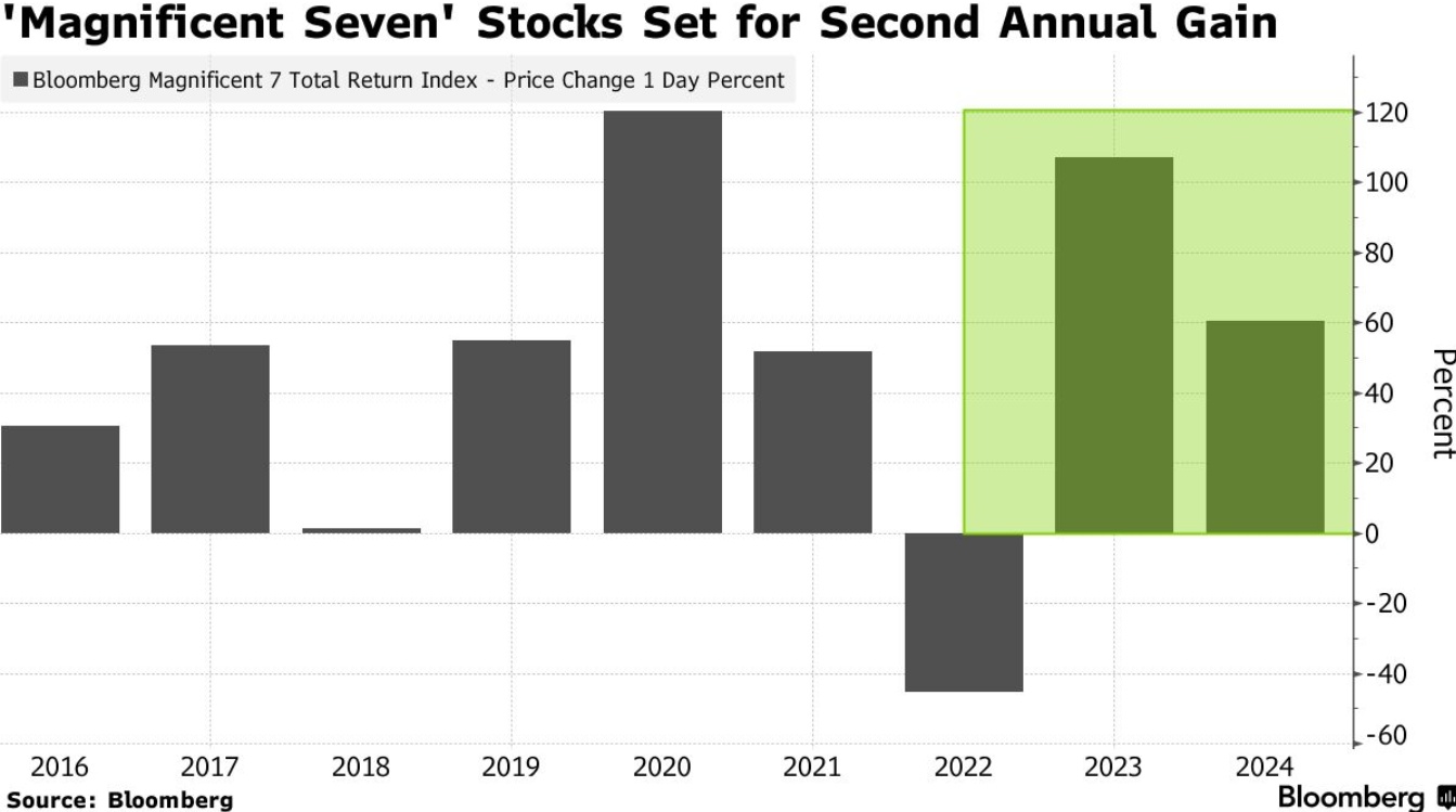 彭博所编制衡量这七大科技巨头涨幅的指标在2023年翻了一番后,今年迄今为止已飙升约60%。意味着如果投资组合2023年以来坚定持有这七大科技巨头,2023年投资回报率实现翻番,今年已获得高达60%收益。