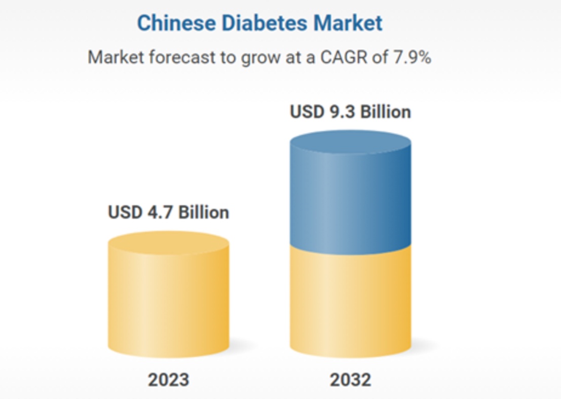 《报告》指出,2023年中国糖尿病市场规模达到47亿美元,预计到2032年市场规模可能达到93亿美元,2023-2032年期间的复合年增长率(CAGR)为7.9%。