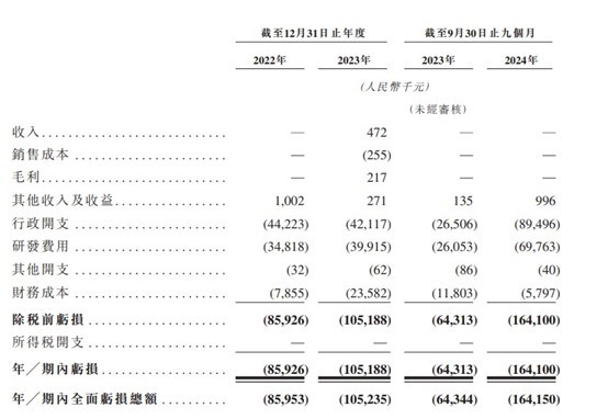 具体而言,截至2022年度、2023年度、2023年及2024年截至9月30日止九个月,华芢生物年/期内全面亏损总额分别约为8595.3万元、1.05亿元、6434.4万元、1.64亿元(单位为人民币,下同)。