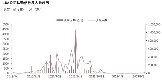 2020年至2021年上半年,18A公司在认购倍数和认购人数上都呈爆发式增长,于2021年2月达到历史高峰,随后便快速下滑,2022年至今持续处于低位。