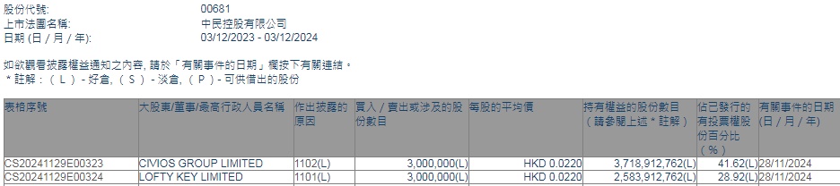 LIMITED增持中民控股(00681)300万股,每股作价为0.022港元,总金额6.6万港元。增持后最新持股数目约为25.84亿股,持股比例为28.92%。
