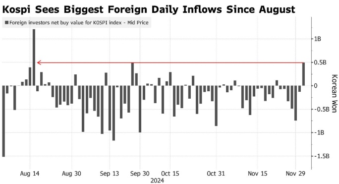 智通财经获悉,韩国基准股指吸引了3个多月来最大的外资流入,原因是美国强劲的经济数据预示着这个出口导向型国家的经济增长。周二,全球基金净买入了5396亿韩元(3.85亿美元)的Kospi指数成份股,这是自8月16日以来的最高水平,这推动该指数在连续两天下跌后上涨1.9%。