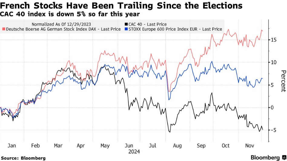几个月来,投资者一直对法国的政治困境感到担忧,而与此同时,法国政府一直在努力推动减少庞大赤字的措施。巴尼耶政府最初提出的预算法案包括600亿欧元(合630亿美元)的增税和削减开支,旨在将赤字占经济产出的比例从今年的6.1%大幅调整到2025年的5%。
