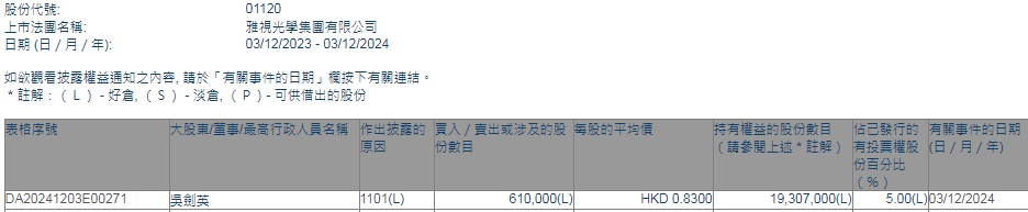 智通财经APP获悉,香港联交所最新资料显示,12月3日,执行董事吴剑英增持雅视光学(01120)61万股,每股作价0.83港元,总金额为50.63万港元。增持后最新持股数目为1930.7万股,最新持股比例为5%。