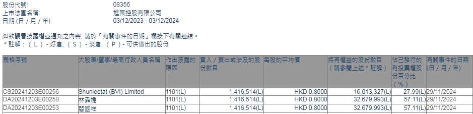 智通财经APP获悉,香港联交所最新资料显示,11月29日,董事会主席简国祥增持进业控股(08356)141.6514万股,每股作价0.8港元,总金额约113.32万港元。增持后最新持股数目为3267.9993万股,最新持股比例为57.11%。