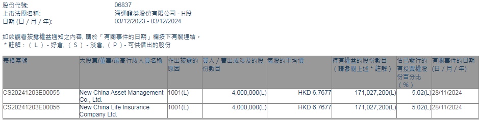 Ltd.增持海通证券(06837)400万股,每股作价6.7677港元,总金额2707.08万港元。增持后最新持股数目约为1.71亿股,最新持股比例为5.02%。