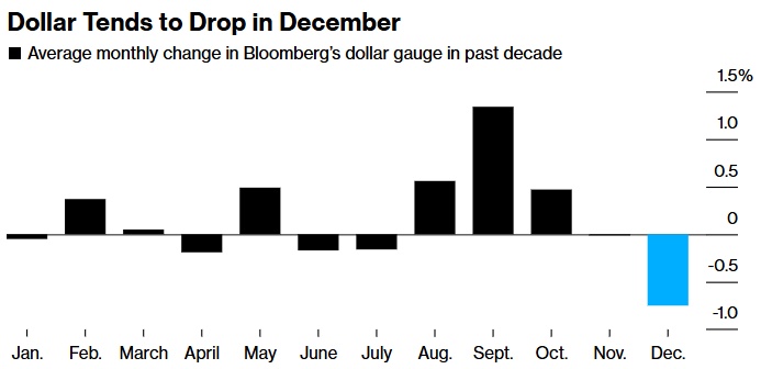 与此同时,美元多头正进入一个历史上一直对美元不利的月份。季节性因素显示,从现在开始到年底,美元升值的可能性不大。在最近10年所有的12月份里,美元有8次出现下跌,往往是年末投资组合再平衡流动和所谓的“圣诞反弹”(Santa Rally)的牺牲品。圣诞反弹激励着交易商抛售美元,买入股票等风险较高的资产。
