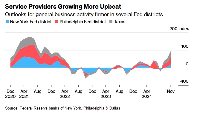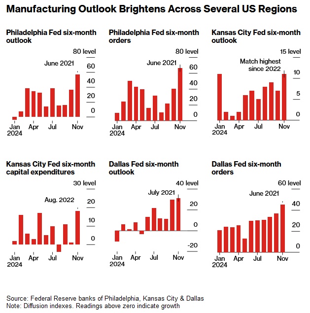 自大选以来公布的几项美联储制造业调查结果反映了这种乐观情绪。纽约联储制造业指数(NY Empire State Manufacturing Index)在11月的飙升幅度为2020年6月以来最大,工厂和服务业对资本支出、销售和一般商业活动的短期前景也表现出多年来最乐观的态度。一项针对费城联储地区制造商的调查显示,商业活动和订单前景升至2021年年中以来的最高水平。堪萨斯联储的调查显示,对未来6个月资本支出的预期为2022年以来最强。德克萨斯州的生产商对商业活动的乐观程度达到了过去三年来的最高水平。
