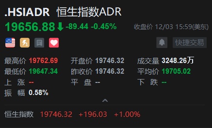 智通财经APP获悉,周二美股三大指数涨跌不一,恒生指数ADR下跌,按比例计算,收报19656.88点,较香港收市下跌89.44点或0.45%。