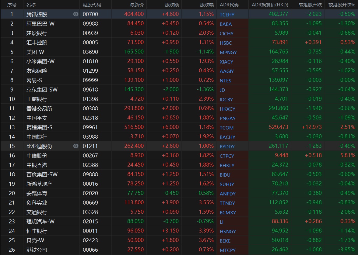 大型蓝筹股多数下跌,汇丰控股收报73.891港元,较香港收市涨0.53%;腾讯控股收涨402.377港元,较香港收市跌0.5%。