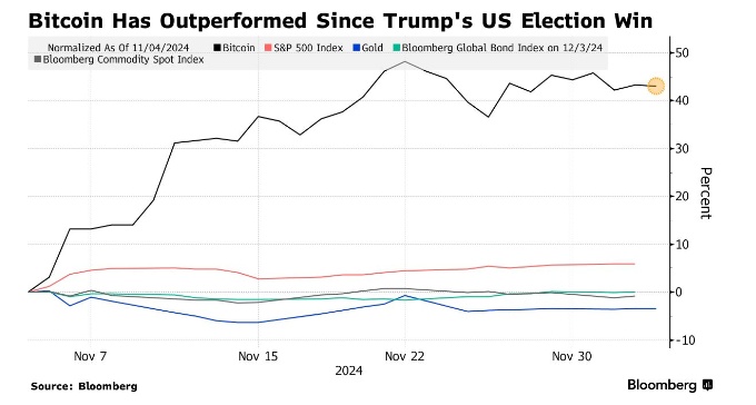 周三亚市早盘,比特币的交易价格徘徊在9.6万美元附近,自特朗普11月5日赢得大选以来,比特币上涨了40%以上。这位候任总统计划撤销拜登政府对数字资产的打压。