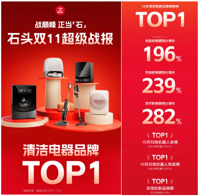 据各大电商平台的数据显示,在京东平台上,石头科技全品类销售额同比增长196%,洗地机和洗衣机销售额分别同比增长239%和282%。旗舰产品扫拖机器人P20 Pro同时位居“10月扫地机器人金榜”和“热卖榜”首位。在天猫平台上,石头科技的洗衣机销售额同比增长408%,其中,迷你洗烘一体机M1和分子筛洗烘一体机Z1跻身热销榜前列。在抖音平台上,扫地机销售额同比增长105%,洗地机和洗衣机销售额分别暴增2532%和12672%。G20S Ultra等核心产品在商品榜、品牌榜中名列前茅。