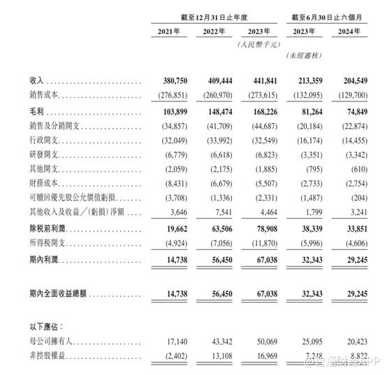 业绩方面,招股书显示,在过去的2021年、2022年、2023年和2024年前六个月,大众口腔的营业收入分别为3.81亿元人民币(单位,下同)、4.09亿元、4.42亿元及2.05亿元,相应的净利润分别为1473.8万、5645.0万、6703.8万及2924.5万元。