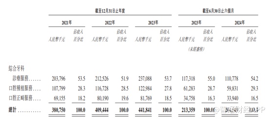 分业务来看,作为一家以小区为中心的口腔医院,大众口腔的日常口腔健康业务占比最高,招股书显示,大众口腔的诊疗服务收入占比超过50%,2021年至2023年,诊疗服务收入分别为2.04亿元、2.13亿元、2.37亿元,分别占总收入比重的53.5%、51.9%寄53.7%。截止2024年6月30日止,诊疗服务收入1.11亿元,占总收入比重的54.2%。