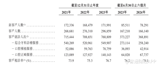 可以看出,大众口腔的诊疗服务及口腔种植服务业务占比波动相对较小,而口腔正畸波动相对大一些,这或许与大众口腔定位有关。定位于社区,主要服务的客户基本上为附近的社区居民,因此客户复诊率较高,截至2024年6月30日,大众口腔的客户复诊率由2021年的73.9%提升至78.1%。