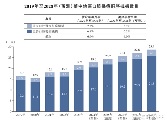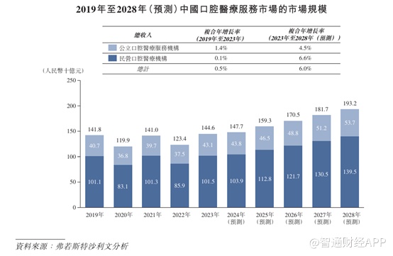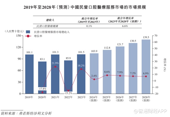 就行业来看,由于疫情后的经济复苏较预期慢,中国口腔医疗服务市场的市场规模估计增长将放缓。沙利文预计中国口腔医疗服务市场的市场规模将于2028年达到1932亿元, 2023年至2028年按复合年增长率6.0%增长。特别是,预期2028年中国民营口腔医疗服务提供商产生的总收入将达到1395亿元,即2023年至2028年的复合年增长率为6.6%。