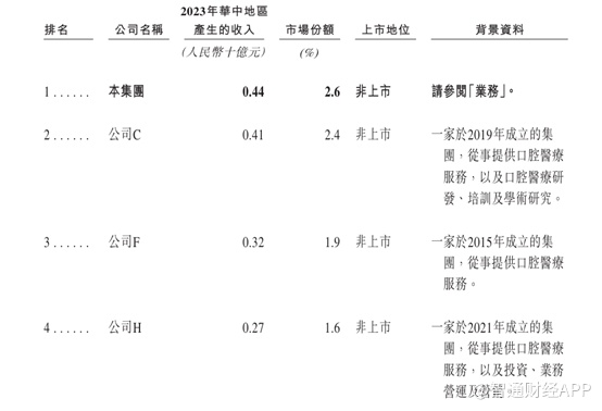 而根据弗若斯特沙利文的资料,按2023年华中地区产生的收入计,大众口腔在华中地区所有民营口腔医疗服务提供商中排名第一,市场份额约为2.6%。不难看出,市场竞争激烈,且高度分散。