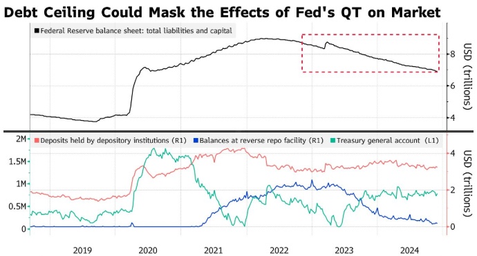 道明证券美国利率策略主管Gennadiy Goldberg表示:“随着债务上限开始压低TGA余额、暂时增加体系中的准备金,美联储在监测QT的影响方面可能是盲目的。这也增加了这样一种风险,即一旦债务上限提高,准备金迅速减少,导致彻底的短缺。”