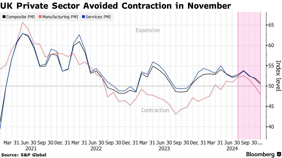 英国企业预计将受到最低工资大幅上涨和增税措施的打击。标普全球市场情报经济学主管Tim Moore表示:“外界普遍认为,对秋季预算中宣布的政策——尤其是那些推高就业成本的政策——所造成影响的担忧,导致人们对企业投资前景和英国整体经济前景的评估更加悲观。”该机构表示,英国企业已采取冻结招聘和不替换自愿离职者的方式,以应对预算案导致的成本大幅上涨。