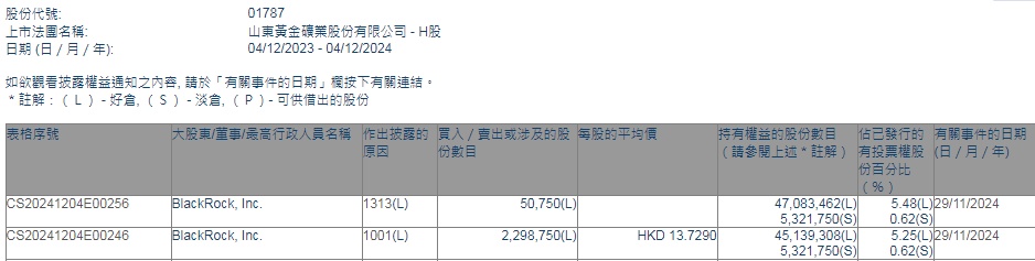 智通财经APP获悉,香港联交所最新资料显示,11月29日,贝莱德增持山东黄金(01787)229.875万股,每股作价13.729港元,总金额约为3155.95万港元。增持后最新持股数目为4513.93万股,最新持股比例为5.25%。