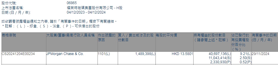 智通财经APP获悉,香港联交所最新资料显示,11月29日,摩根大通增持福莱特玻璃(06865)148.9398万股,每股作价13.5801港元,总金额约为2022.62万港元。增持后最新持股数目约为4069.71万股,最新持股比例为9.21%。