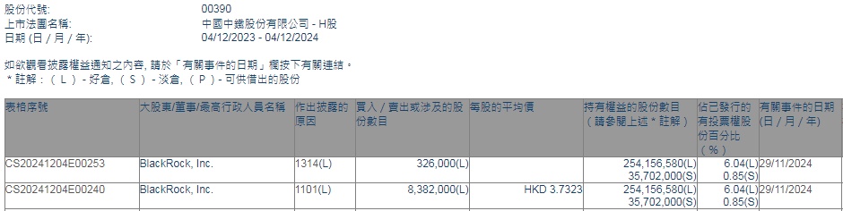 智通财经APP获悉,香港联交所最新资料显示,11月29日,贝莱德增持中国中铁(00390)838.2万股,每股作价3.7323港元,总金额约为3128.41万港元。增持后最新持股数目约为2.54亿股,持股比例为6.04%。