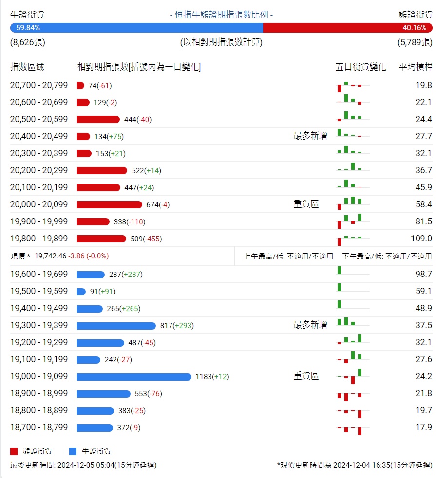 智通财经APP获悉,截至12月5日,恒指最新的牛熊街货比例为60:40。