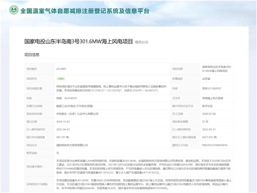全国温室气体自愿减排注册登记系统及信息平台显示,国家电投集团山东半岛南3号301.6兆瓦海上风电项目的状态被更新为“已登记”,是CCER市场重启后首个项目完成登记。该项目业主为海阳电投风力发电有限公司,系中国电力(02380)的全资子公司。