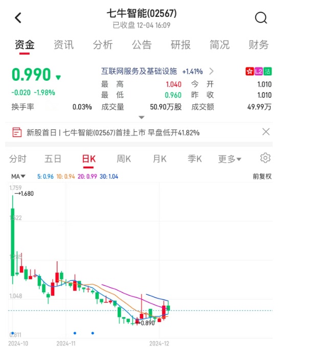 自10月16日上市以来,七牛智能(02567)一路低走。截至12月4日收盘,公司报0.99港元,总市值约为19.77亿港元。相较于2.75港元的发行价,七牛智能股价缩水64%,总市值蒸发约35亿港元。