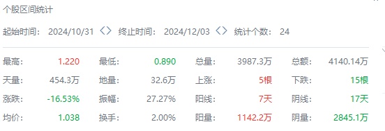 在首日大跌之后,七牛智能难挽颓势,成交量与换手率均呈现下滑态势。自10月31日至12月3日,七牛智能的跌幅达16.53%,阴跌17天,24个交易日总换手率仅为2%,成交量为3987.3万股,日均成交量不足170万股。