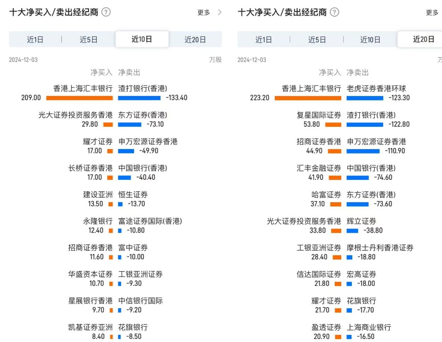 从席位上看,近20日,七牛智能卖方席位前五位分别为老虎证券香港环球、渣打银行(香港)、申万宏源证券香港、中国银行(香港)及东方证券(香港),分别卖出123.30万股、122.80万股、110.90万股、74.60万股及73.60万股。近10日,七牛智能卖方席位前五位渣打银行(香港)、东方证券(香港)、申万宏源证券香港、中国银行(香港)及恒生证券,分别卖出133.40万股、73.10万股、49.90万股、40.40万股及13.70万股。总体来看,卖方前五大席位较为重合。